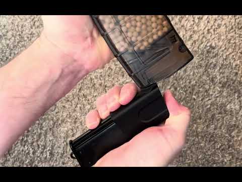 2. Insert the nozzle of your speed loader into the hole of the adapter. A special tooth inside the adapter pushes down a lever allowing for an easier first-BB load.